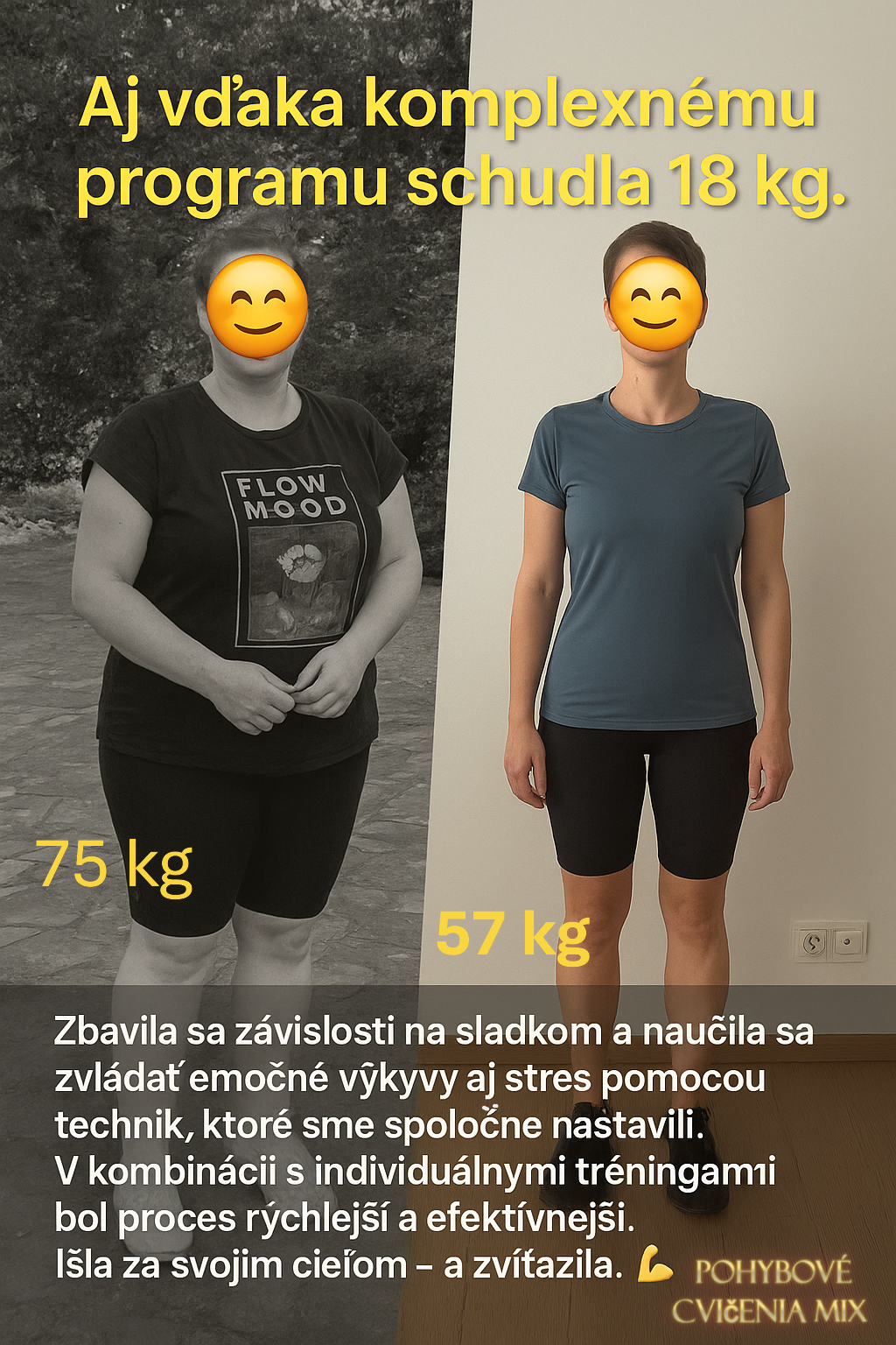 Ja môžem len odporučiť komplexný program od Pohybové cvičenia. Fyzicky, emočne, mentálne spravila zo mňa nového človeka. Veľká výhoda tohto balíka je, že Vás Erika spozná z každej stránky, vie presne nastaviť plány tréningov aj konzultácií. Všetko na jednom mieste s profesionálnym prístupom od Eriky